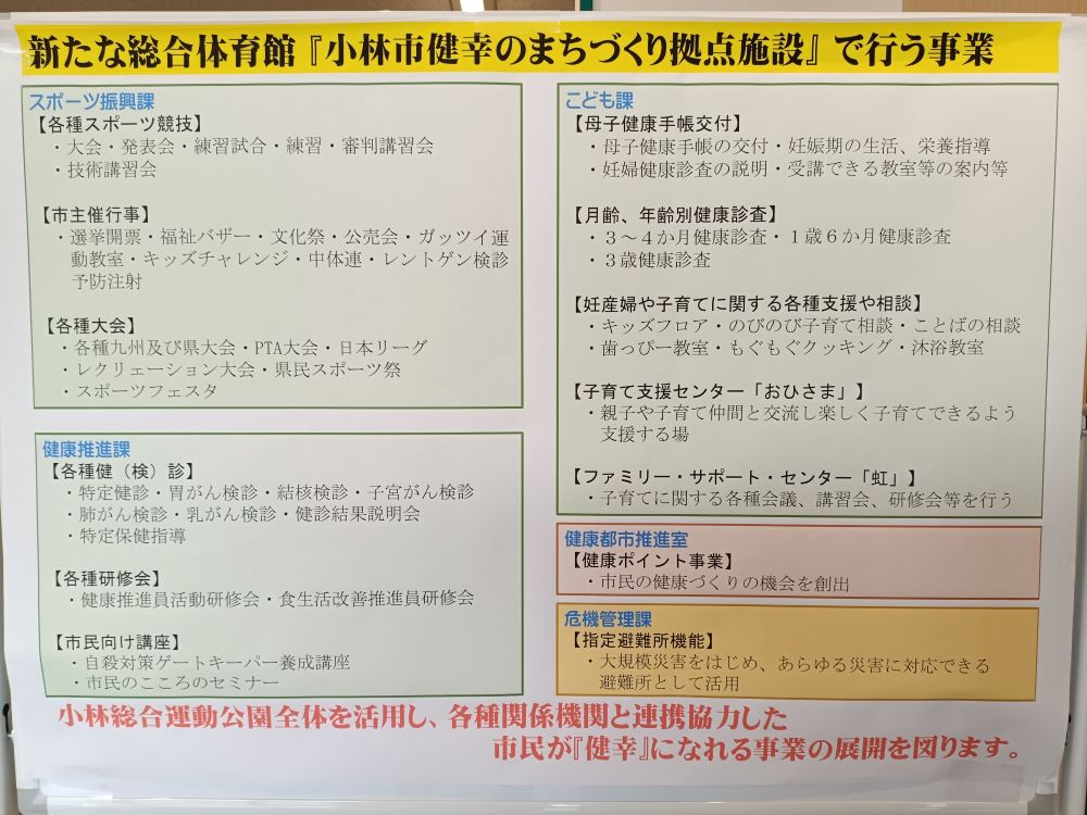 先日竣工式がありました★、複合体育館の内覧会に行ってみました。 体育館内の客席後方は、一周200mあるそうです。 観客席は客席の間を広めに取っておりましたので、観客が座っている前を通る時に、座っている方が足を避けたり避けてもらったり、ということがなさそうです。 今後の活用については、下記のような予定になっているそうです。