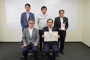 こちらも、授与式が執り行われる総会の開催が新型コロナウイルス感染症の影響により見送られたことから、9月9日(水)同社九州支店の支店長 荒金様と藤井様が坂下組宮崎本社に来社され、感謝状を授与いただきました。