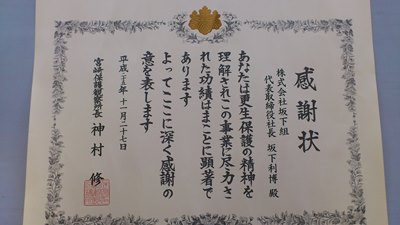 この度は、宮崎保護観察所長より更生保護の精神を理解し、